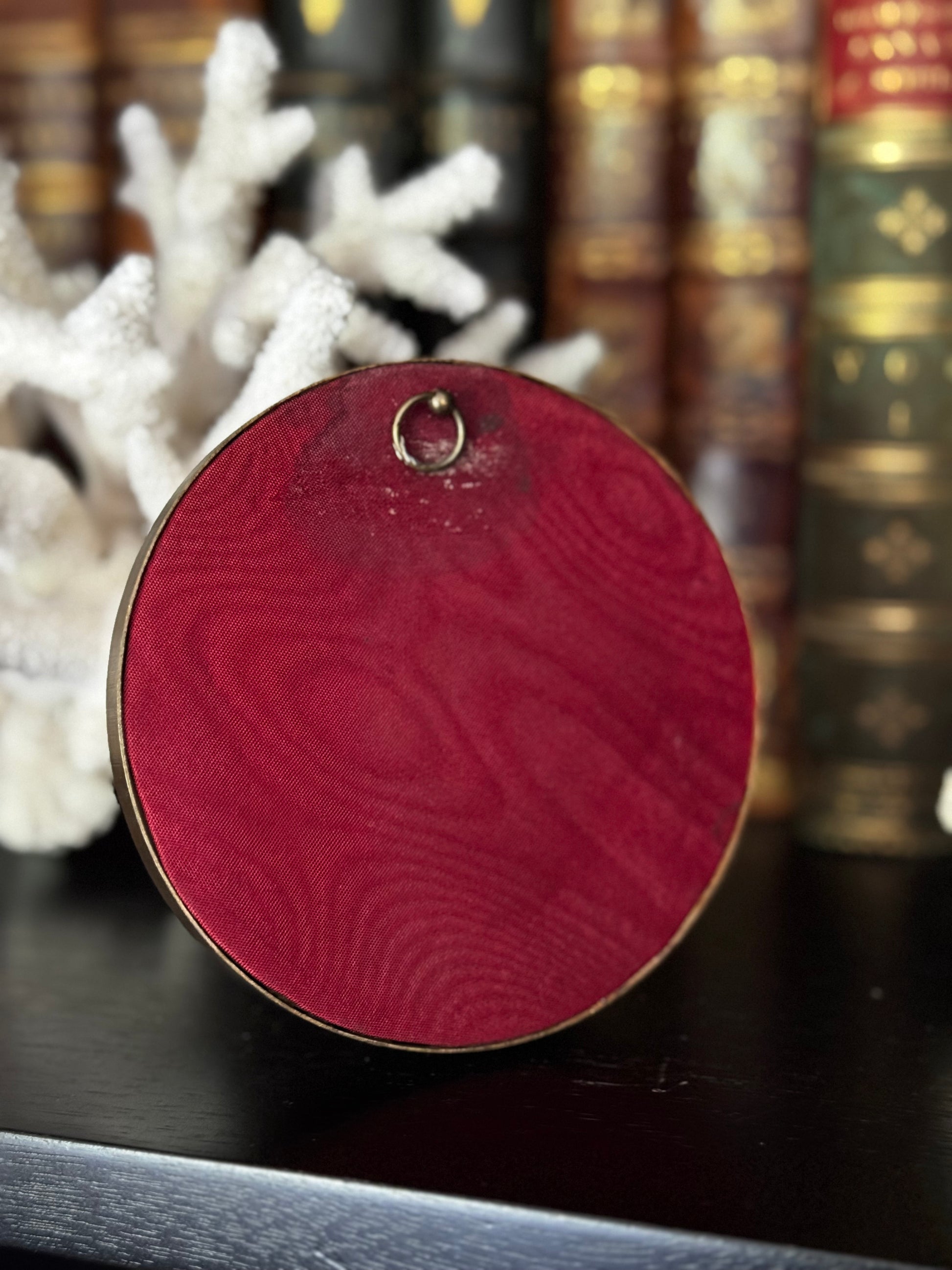 French miniature oil painting on ivory depicting a chateau. Mounting in a round frame with velvet detailing. Some wear to frame consistent with age. 4.5"